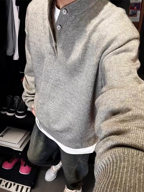 1.休闲裤的宽松版型与亨利领的正式感形成对比,适合日常休闲穿搭。