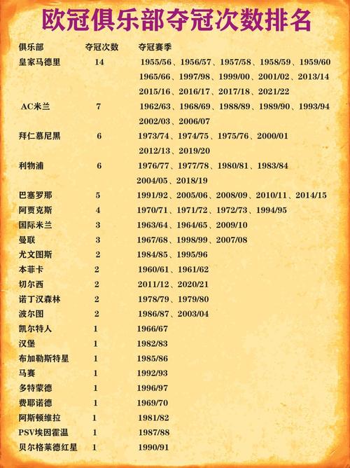 1.欧冠冠军次数最多的排名:皇家马德里在欧洲联赛中夺冠次数最多,这个排名无可争议地位于第一位。