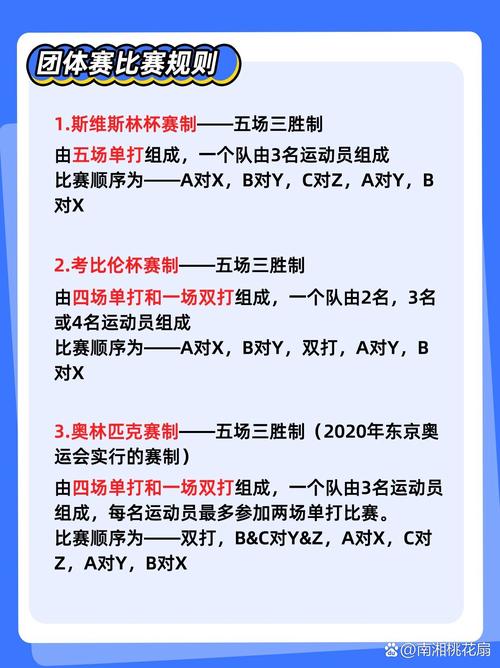 📝 文章摘要:乒乓球作为一项全球性的热门运动,其比赛规则的变化总是受到广大乒乓球爱好者的关注。小编将为您详细解读最新乒乓球团体赛规则表,帮助您更好地了解和参与这项运动。(图片来源网络,侵删)一、比赛形式1.比赛采用五局三胜制,每局采用七局四胜制。2.比赛...
