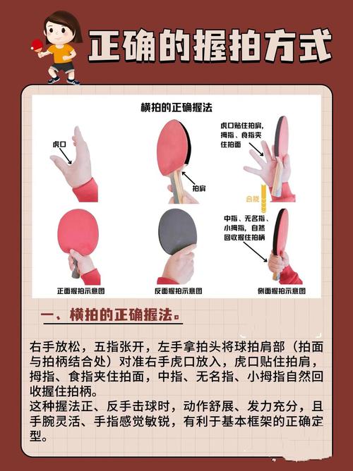 1.正确握拍:采用横板握拍法,拇指和食指自然弯曲,中指、无名指和小指轻轻搭在拍柄上,保持手部放松。
