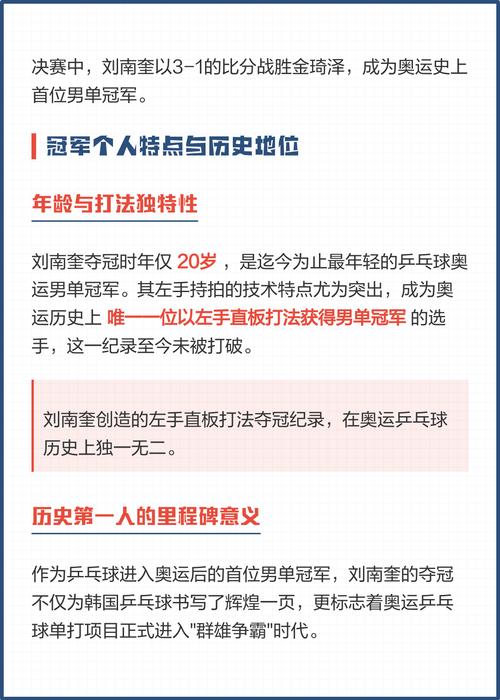 📝 文章摘要:一、回顾1988年奥运乒乓男单冠军的历史时刻(图片来源网络,侵删)在1988年的汉城奥运会上,乒乓球男单比赛成为了全球瞩目的焦点。我国运动员许胜举世瞩目地夺得了金牌,成为那一届奥运会的乒乓王子。这一历史性的时刻,不仅代表了我国乒乓球运动的巅...